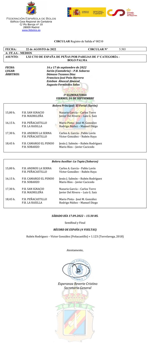CAMPEONATO DE ESPAÑA PAREJAS PRIMERA CATEGORIA 2022: