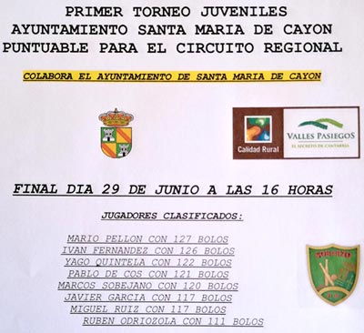 CADETES.- Campeón RAUL CARRAL 124 bolos Subcampeón JESUS FERNANDEZ con 107, Tercero IVAN MARTINEZ y Cuarto ADRIAN ARREGUI INFANTILES.- Campeón ALEJANDRO ORTIZ con 117 bolos Subcampeón JAVIER ESQUINAS con 107 bolos, Tercero LUCIA TERAN, Cuarto DARIO RODRIGUEZ, Quinto MARCO GUTIERREZ y Sexto GABRIEL GARCIA ALEVINES.- Campeón JUAN RUIZ con 108 bolos, Subcampeón DANIEL SAINZ con 90 bolos, Tercero ADRIAN MERINO, Cuarto LUCA HUMARA, Quinto SERGIO MANTECON, Sexto AVELINO CARRAL, Séptimo MARCO MARTINEZ BENJAMINES.- Campeón IKER COSSIO con 103 bolos (gano el desempate), Subcampeón ALEX FERNANDEZ con 103 bolos, Tercero MATIAS RUIZ MINIBENJAMINES.- Campeón LUIS GANDARILLAS, Subcampeón HECTOR ECHEVARRIA