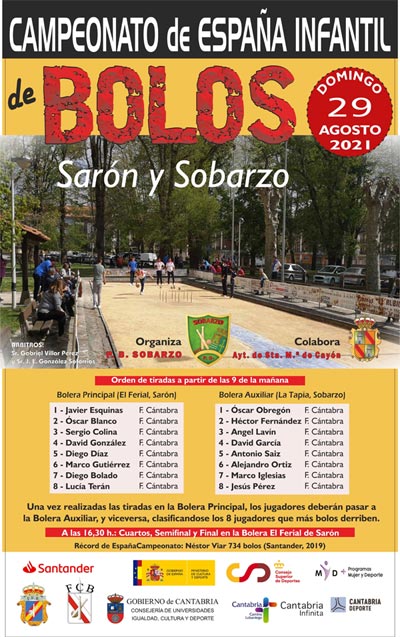 Sergio Colina con 678 bolos CAMPEON DE ESPAÑA INFANTIL en Saron en una final en que hubo que birlar la última bola (tenía que birlar 13 para ganar) derroto a Diego Diaz que totalizo 677 bolos, Tercer clasificado Alejandro Ortiz con 526, Cuarto David García con 360(no pudo jugar la semifinal por lesión), Quinto Marco Gutiérrez con 355, Sexto Javier Esquinas con 353, Séptimo Oscar Blanco con 348 y Octavo Jesús Pérez con 336 bolos. Quedaron eliminados por la mañana Ángel Lavín 238, Diego Bolado 236, Marco Iglesias 232, Antonio Saiz 227, Héctor Fernández 226, Oscar Obregón 225, David González 213 y Lucia Terán con 210 bolos. Entrega de Trofeos el presidente de la F.E.B. D. José Luis Diaz Rojas, el director general de Deportes D. Mario Iglesias, la alcaldesa del Ayuntamiento de Santa María de Cayón Dª Pilar del Rio, el concejal de Deportes de Cayón D. Oliver Trespalacios, el director de la Modalidad de Bolo Palma de la F.E.B. D. Luis Ángel Mosquera y el flamante Campeón de España de 1ª con récord Víctor González. Un gran campeonato con una final espectacular retrasmitida por Onda Occidentes y Popular TV.