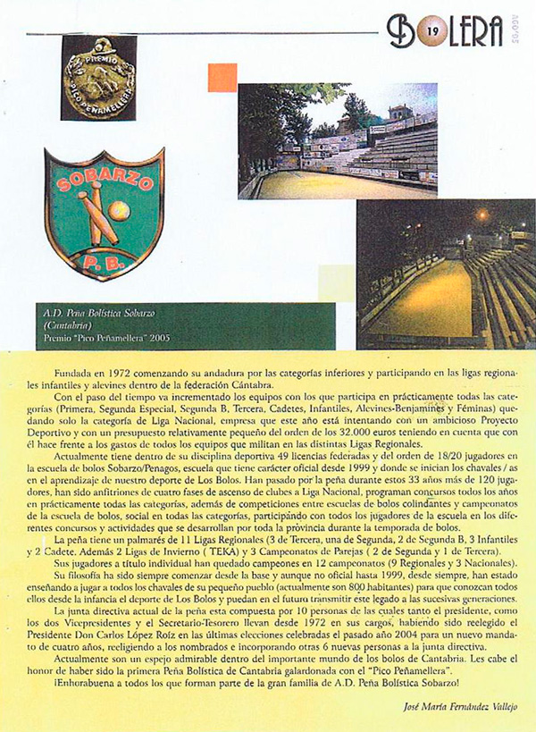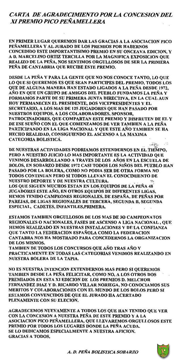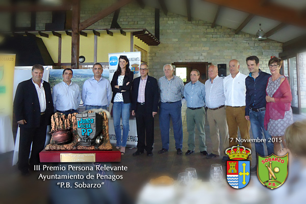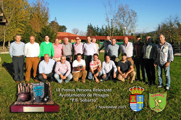 El III PREMIO PERSONAS RELEVANTES DE PENAGOS, ha recaido en la Peña Bolistica Sobarzo, en reconocimento a los meritos de mas de 40 años en los bolos llevando el nombre del pueblo SOBARZO y del Ayuntamiento PENAGOS por toda la geofrafia regional y nacional. Agradecemos este premio del que son participes los 172 jugadores que han pasado por la peña durante estos años desde su fundacion en 1972, los directivos, simpatizamentes, aficionados, colaboradores, patrocinadores, sponso y todos los que han apoyado y apoyan a la Peña en su andar diario. Invitamos a todos a participar en este acto tan importante para la PEÑA. Muchas gracias al jurado del premio por este reconocimiento.