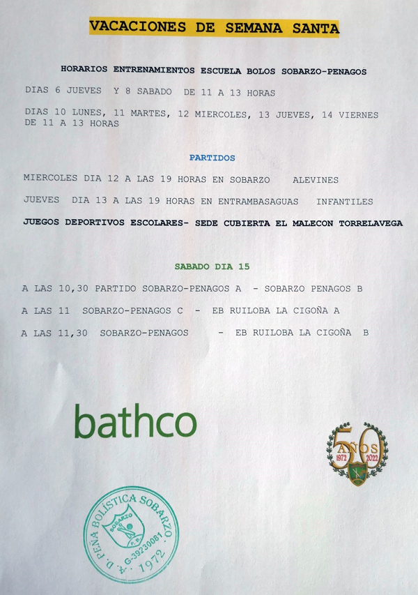 ESCUELA DE BOLOS SOBARZO-PENAGOS VACACIONES SEMANA SANTA: