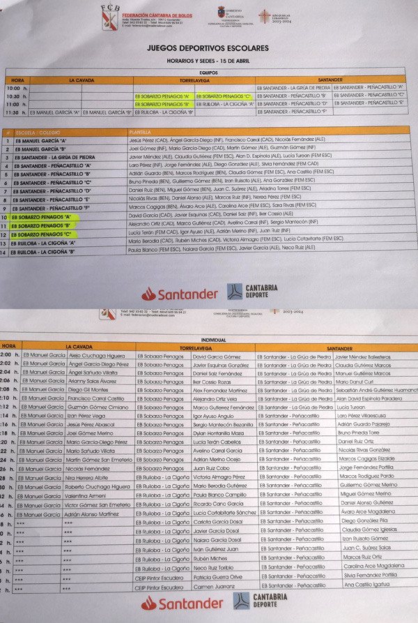 EL DIA 15 la Escuela participará individualmente con 14 alumnos y con 3 equipos en los JUEGOS DEPORTIVOS ESCOLARES Fase que se disputa en la bolera cubierta del Malecón en Torrelavega.